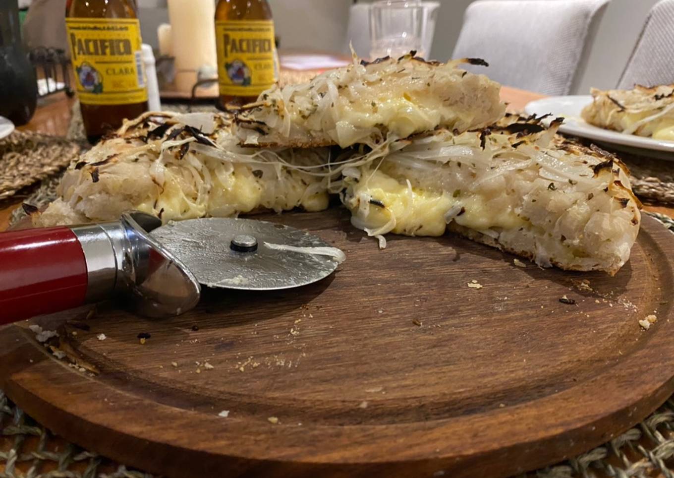 El otro día estaba mirando Street Food en Netflix y justo el primer capítulo habla de la comida callejera argentina. Allí me enteré que la fugazzeta fue inventada en mi país y me llenó de orgullo. Además es una de las preferidas de mi esposo. Así que después tuve que ponerme a la tarea de hacerla en casa. Tenía masa madre así que además quedó con el toque crujiente que le dan las levaduras naturales, pero puede hacerse con la masa de pizza tradicional.