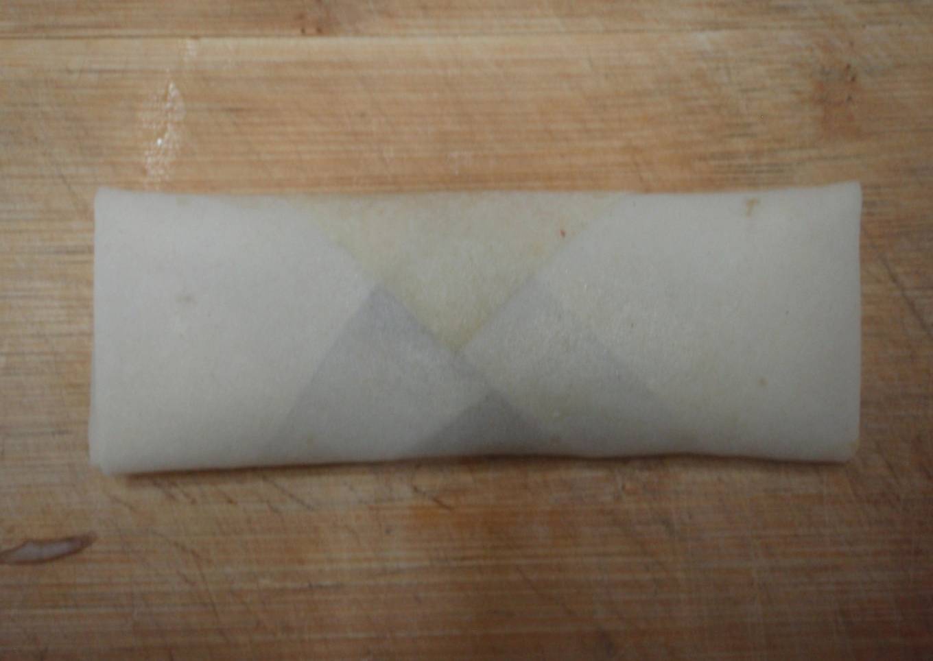 - Tomamos la tortilla colocándola como diamante frente a nosotros, ponemos un puño de relleno cerca de la esquina inferior y doblamos hacia adelante (ver imagen), enrollamos a la mitad y doblamos las puntas cubriendo el relleno, con una brocha de pastelero untamos el huevo batido en la punta superior y terminamos de enrollar.