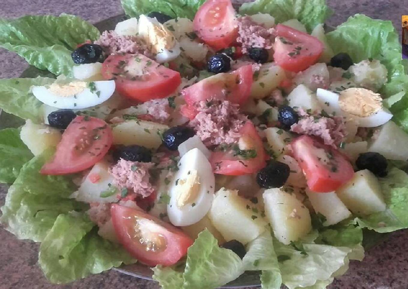 - Ponemos nuestra ensalada encima de la lechuga y la decoramos con el huevo cocido y trozos de tomate, perejil y atún.