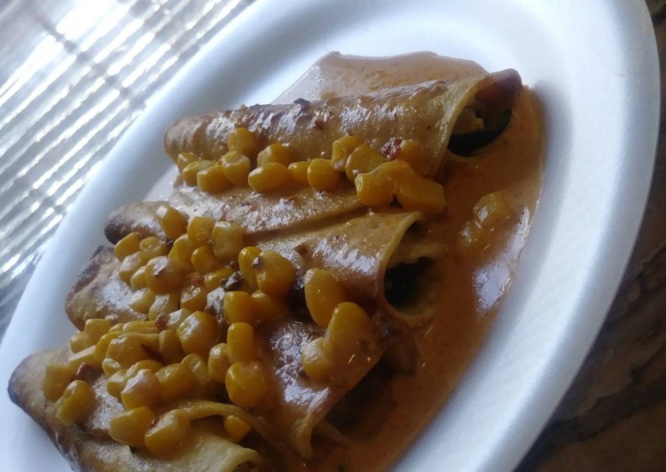 - Como ya la sartén de los chiles poblanos quedó vacía (sin pollo) poner las 2 c de salsa de chipotle, lo que le sobre de la crema y el resto del elote, agregue un poquito de sazón y 1/2 taza de leche y bañe los tacos previamente servidos!