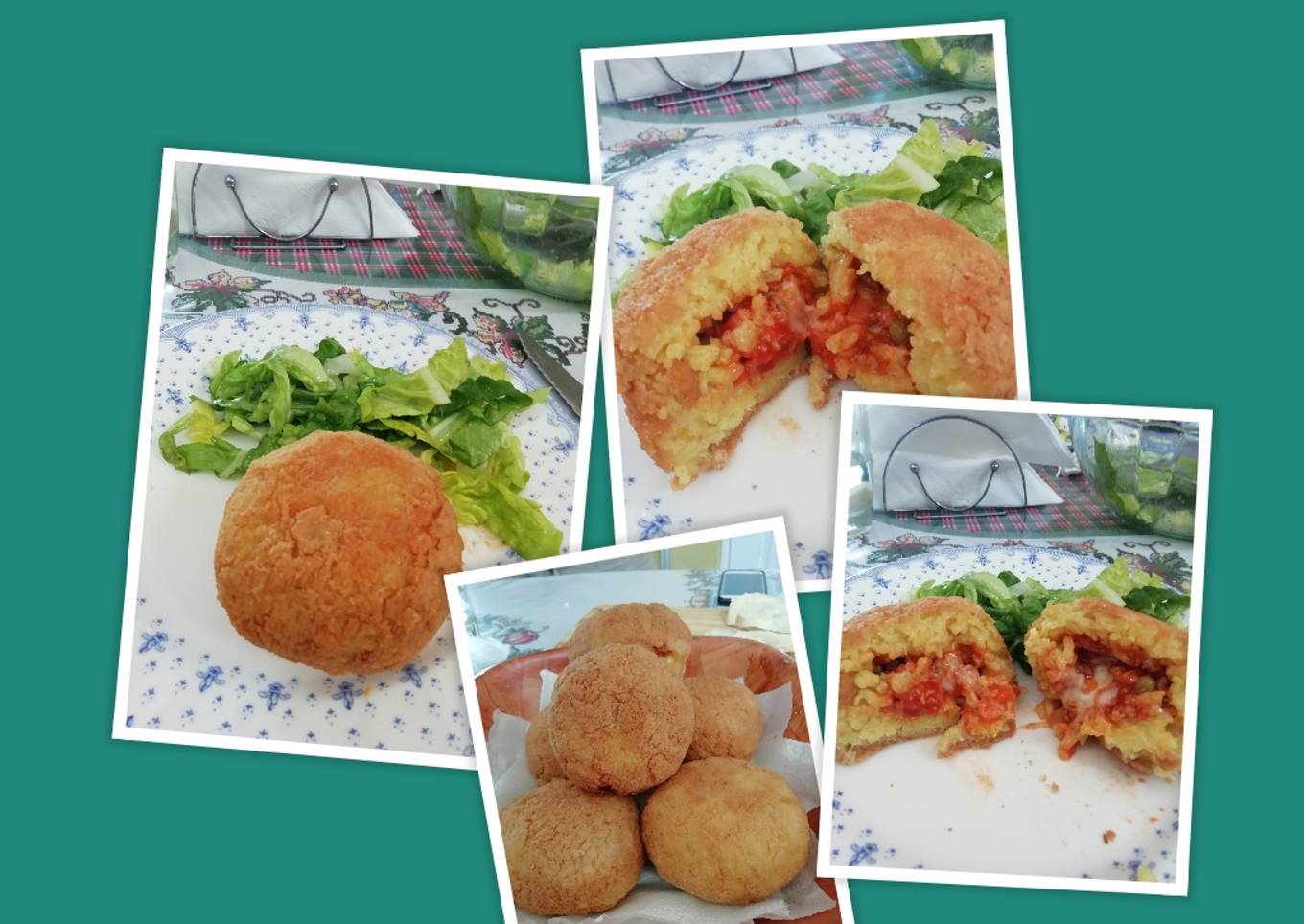 - Con el arroz y el relleno frío vamos tomando porciones de arroz con las manos húmedas. Ahuecamos la mano y colocamos una cucharada de relleno y un cubito de mozzarella. Cerramos con cuidado formando una bola. Al principio no me resultó fácil, después me salió mejor! Mezclamos la harina con agua. Debe quedar un empaste como el de panqueques. Después las pasamos por pan rallado.