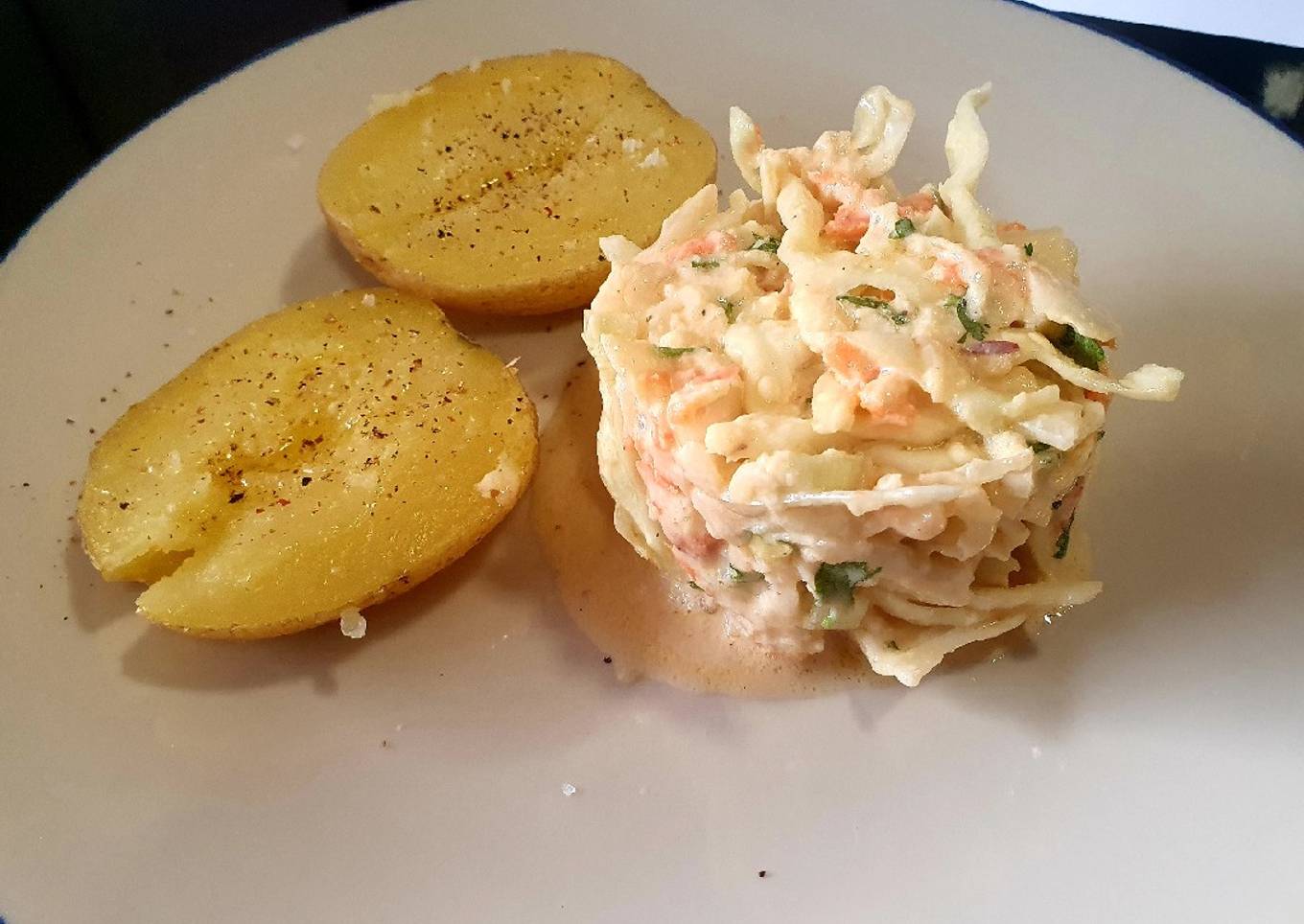 Hace calor y apetecen cenas fresquitas y sencillas. En Inglaterra las patatas asadas son comida nacional, tanto que muchas veces se venden por la calle, a veces con un relleno a elegir. Los rellenos más comunes son queso, baked beans, chile con carne o coleslaw, ensalada americana que se hace con col, zanahoria, cebolla y mayonesa. Ayer decidí hacer una ensalada al estilo de la coleslaw, echando también manzana y, en vez de mayonesa, queso ricotta. Y la patata asada la hice en microondas en tan solo 5 minutos (tardan una hora en horno). Comparto el truco en el ingrediente patatas 😄 😉👌🏼¡Espero que os guste!