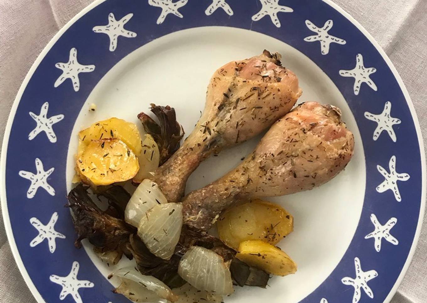 - Coloca en la fuente de horno las patatas, la alcachofa, los tres trozos de pimiento y la cebolla. Coloca encima los muslos.Aprovecha los jugos que han quedado en el recipiente de precocinar en el microondas, echándolos en la fuente de horno