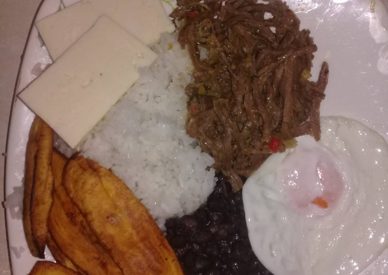 - Luego esmechamos la carne, dividimos el sofrito de las verdura y le añadimos una mitad de sofrito las caraotas y otra mitad del sofrito a la carne y dejamos cocinar hasta que seque un poco, después de esto pelamos los plátanos maduros y hacemos las tajadas y fritamos, fritamos los huevos también y servimos:caraotas, carne, arroz, huevo, tajadas y queso 😝