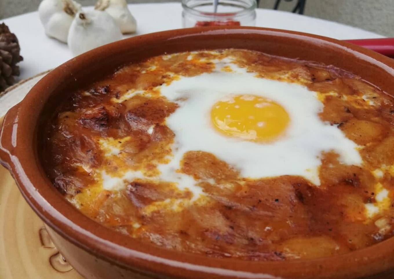 - Pasados los 15 minutos, repartir la sopa en cuatro cuencos de barro especial horno, cascar un huevo encima de cada cuenco, echar unas arenillas de sal por encima y meterlos en el horno durante 10 minutos. Algo característico de esta sopa es que después del horneado se crea una fina costra por encima. Servir inmediatamente.
