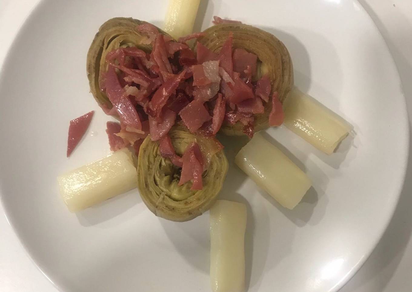 Alcachofas con jamón y oro blanco de Navarra (espárragos frescos)