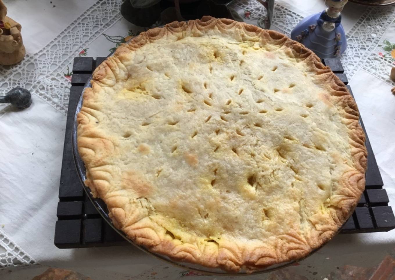 - Pongan un cuadrado de papel parafinadlo sobre la mesa de trabajo ligeramente humedecida para que no se corra cuando le pasen el rodillo. Aplanen con la mano y luego con el rodillo hasta formar, más o menos, un círculo que cubra la base del molde de pie y colóquenlo con la ayuda del papel. Coloque el relleno y la otra masa igual como hizo con la base. Selle los bordes con un tenedor o una cucharita. Haga unos cortes con la punta de un cuchillo para que salga el vapor.