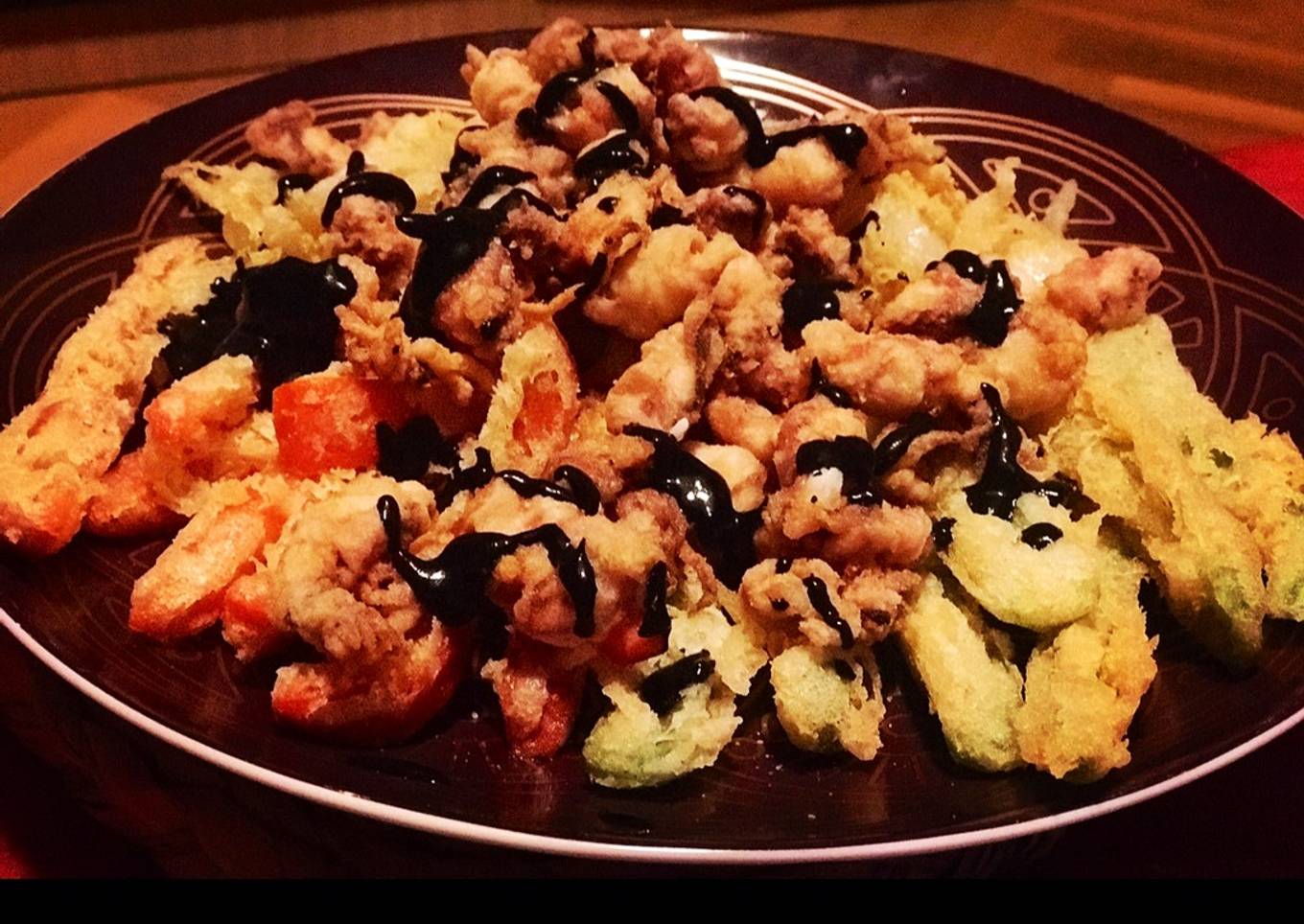 Témpura de verduras y chopitos con tinta de calamar 🦑